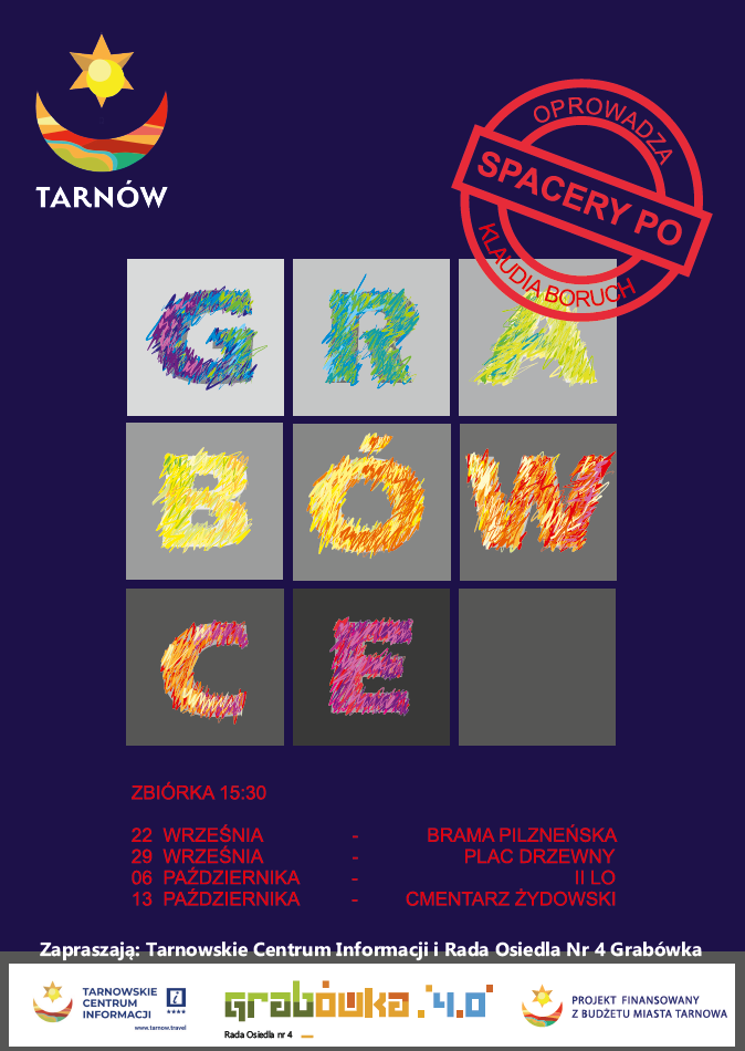 “Spacery po Grabówce” rozpoczniemy zanurzając się w świat Tarnowskich Żydów – mieszkańców naszego miasta, któremu zawdzięczało ono swój niepowtarzalny charakter i koloryt. Historia Tarnowskich Żydów nierozerwalnie wiąże się ze Starym Miastem, Zawalem i Grabówką właśnie, która w XIX i na początku XX w. stała się swoistym Sztetlem  w obrębie Tarnowa. Spacer rozpoczniemy przy Bramie Pilzneńskiej skąd ulicą Wałową, przez Plac Bohaterów Getta, ulicami Dębową, Waryńskiego, Lwowską, Starodąbrowską i Goslara będziemy przemierzać Przedmieście Mniejsze i Grabówkę, która w dużej mierze żyje dziś tylko w archiwaliach i wspomnieniach. Na naszym szlaku odszukamy ślady nieistniejących już żydowskich domów modlitw na czele z imponującą Synagogą im. Franciszka Józefa I zwaną Jubileuszową lub Nową, ale także mniejszych, ale ważnych dla wiernych z których teraz wspomnimy tylko Synagogę Sądecką, Synagogę Debory Weschler, Sztybel Bobowski, Sztybel Chasydów Bełskich, Sztybel Chasydów Pokrzywickich oraz Synagogę Tragarzy. Żaden z domów modlitwy nie przetrwał niestety do naszych czasów w niezmienionej formie i dziś znamy jedynie ich lokalizację, po innych zachowały się mniej lub bardziej dokładne wzmianki w źródłach. Zaledwie w kilku przypadkach stoją jeszcze budynki w których murach mieściły się przed wojną żydowskie sztyble i klojzy.