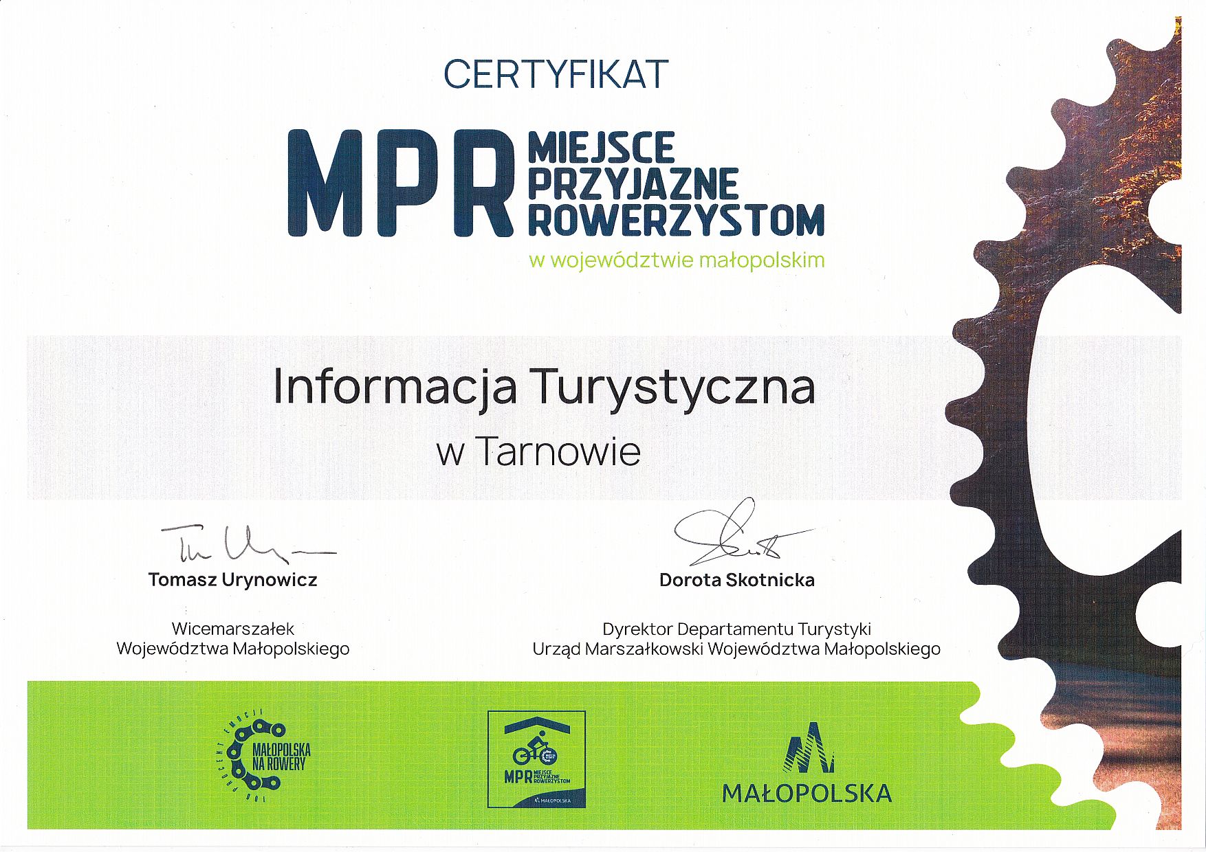 Das Zertifikat „Fahrradfreundliches Objekt in Kleinpolen” für Tarnower Toutistinformation Marschallamt der Woiwodschaft Kleinpolen, Januar 2021 |