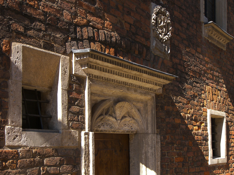 Wśród zwartego ciągu kamienic o elewacjach pokrytych tynkiem, wyróżnia się kamienica z surowej cegły, z bogatą wczesnorenesansową kamieniarką. Nad kamiennym portalem drzwi wejściowych, asymetrycznie, z prawej strony znajduje się wmurowana w ścianę tarcza z herbem Gryf o bogatej ornamentyce. Pod nią zapisana jest data, arabskimi i rzymskimi cyframi, rok 1524. Jeszcze niżej łacińska inskrypcja: Fundatio Domus per Joannem Mikolayowski (Dom zbudowany przez Jana Mikołajowskiego). Powtarza się ta sama data, nazwisko i herb Gryf, także na kamiennym portalu wewnątrz domu.