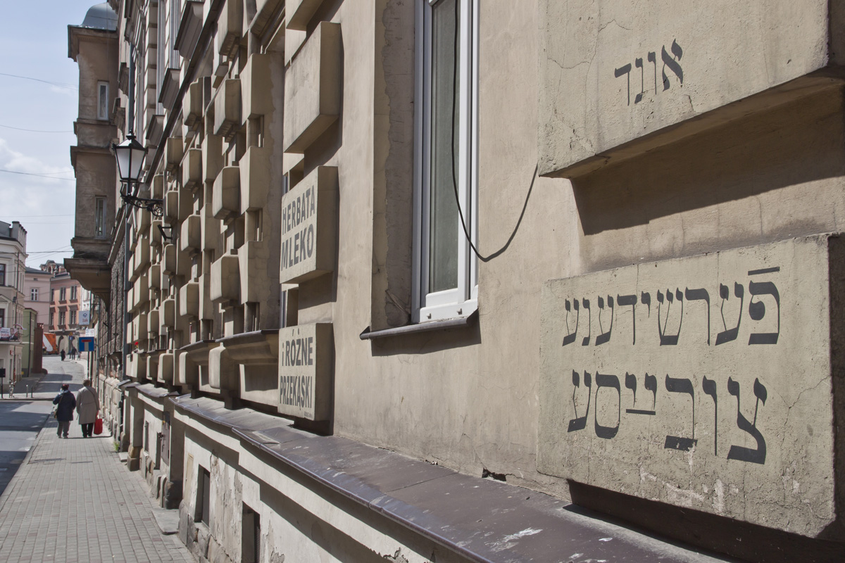 Po przeciwnej stronie, pod numerem 6, zauważalne napisy w języku jidysz i polskim reklamujące dania restauracyjne.