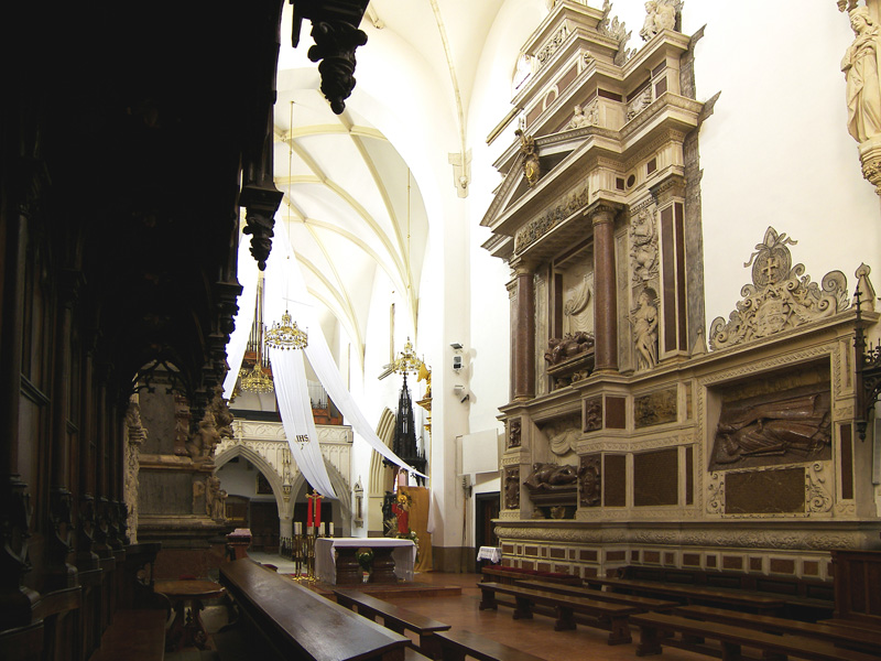 Wewnątrz świątyni znajdują się gotycko-renesansowe nagrobki przedstawicieli rodu Tarnowskich, oraz barokowy nagrobek Ostrogskich, które słusznie uchodzą za jedne z najwybitniejszych dzieł sztuki w Polsce wykonanych przez takich mistrzów jak: Bartłomiej Berecci, Jan Maria Padowano i Jan Pfister.