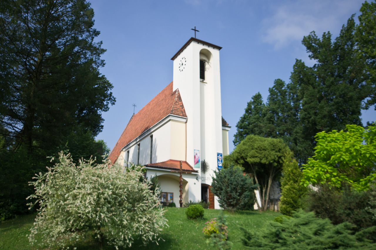 Wyjątkowość tej świątyni nie wynika z jej nietypowych rozwiązań architektonicznych, czy wieku. Wręcz przeciwnie, konsekrowany był w roku 1949, a parafia powstała dopiero w roku 1972. Jednakże historia jego powstania i wyposażenie zasługują na szczególną uwagę. Został postawiony na ziemi należącej do Filomeny Bochenek, matki czwórki dzieci, której trzech synów zostało księżmi. Umierając poprosiła, aby na jej polu wystawili kaplicę Bożego Miłosierdzia. Najmłodszy z synów, Władysław, profesor tarnowskiego seminarium, poznał w czasie wojny w Tarnowie inż. Zbigniewa Rzepeckiego. Zaprzyjaźnili się, w efekcie czego inżynier przygotował dla ks Bochenka plany kościoła. Budowa rozpoczęła się w 1947 r. W fundamenty kościoła wmurowano kromkę z chleba, który matka upiekła w dniu urodzin księdza. Kościół wyposażony jest według koncepcji księży Bochenków, którym do jej wykonania udało się pozyskać wybitnych artystów. Pracami nad polichromią kierowała Felicja Curyłowa z Zalipia. Bronisław Chromy wykonał rzeźbę Chrystusa Dobrego Pasterza, umieszczoną nad wejściem. Pozostałe rzeźby są autorstwa m.in. Jerzego Bandury oraz Anatola i Bogdany Drwalów. Dopełnieniem wystroju są obrazy Jacka Malczewskiego, Szymona Czechowicza, Vlastimila Hofmana, Ludwika Stasiaka.