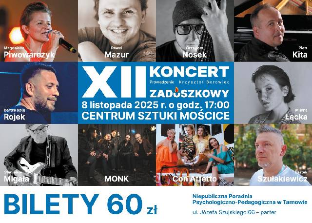 Centrum Sztuki Mościcie ul. Traugutta 1, Tarnów, małopolskie, PolskaW XII edycji zaduszkowego grania będzie można posłuchać: Magdaleny Piwowarczyk, Pawła Mazura, Grzegorza Noska, Piotra Kity, Bartka Rojka, Mileny Łąckiej, Stanisława Migały, Bartka Szułakiewicza oraz zespołów MONK i Con Affetto. Bilety-cegirełki w cenie 60 zł można nabyć w ul. Szujskiego 66, tam gdzie siedzibę ma Niepublicznej Poradni Psychologiczno-Pedagogiczna. Zebrane środki zostaną przekazane na rzecz stowarzyszenia […]