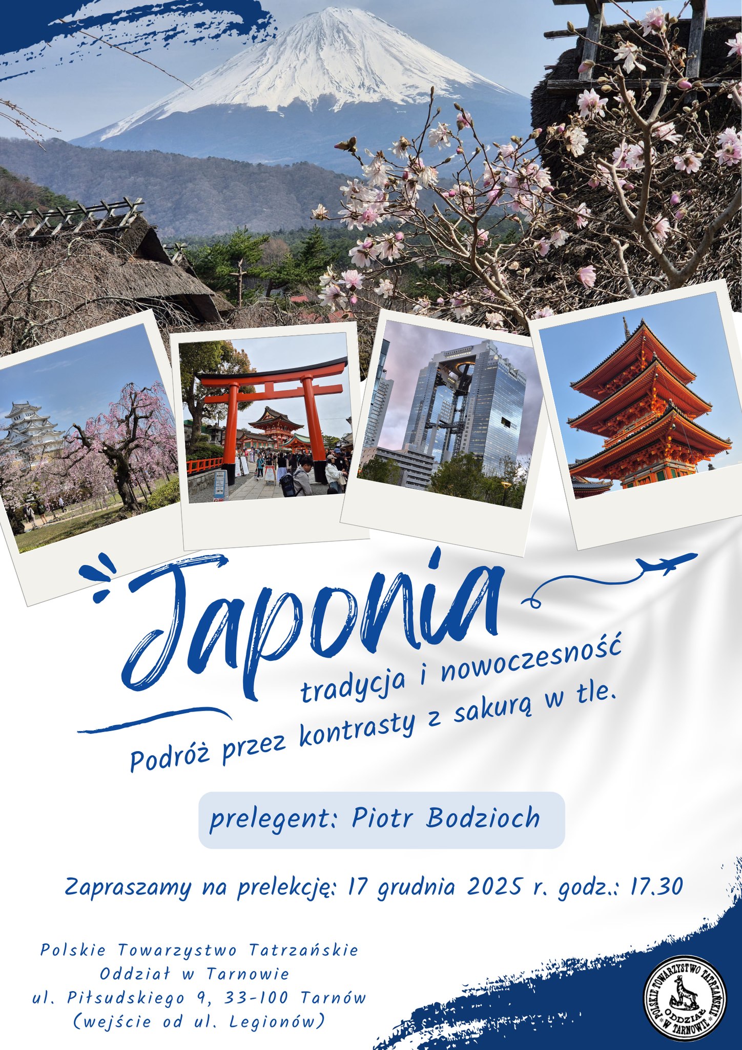 Oratorium księży Filipinów Piłsudskiego 9, Tarnów, małopolska, PolskaPolskie Towarzystwo Tatrzańskie Oddział w Tarnowie zaprasza wszystkich zainteresowanych odkrywaniem świata na kolejny wykład. Tym razem poświęcony on będzie Japonii.Prelekcję zatytułowaną „Japonia – tradycja i nowoczesność. Podróż przez kontrasty z sakurą w tle” wygłosi Piotr Bodzioch. Odbędzie się ona w środę, 17 grudnia o godz. 17.30 w siedzibie tarnowskiego PTT, mieszczącej się w Oratorium XX. […]