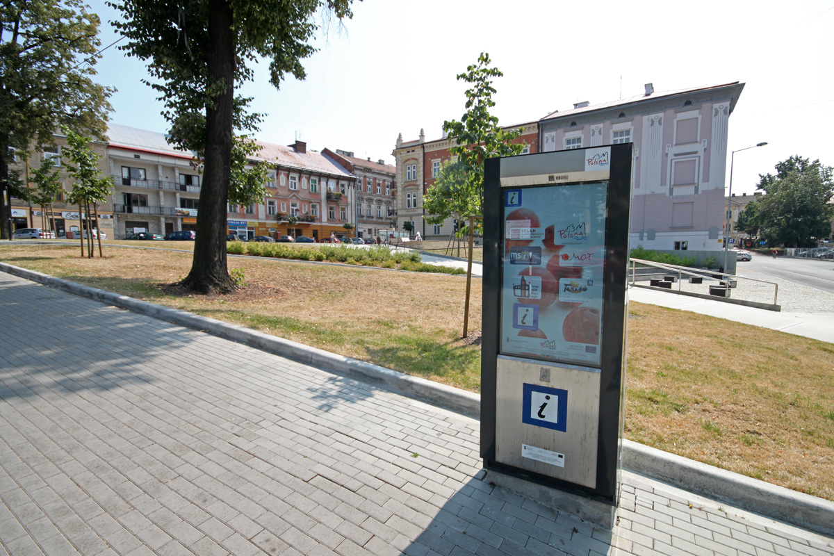 Urządzenie stacjonarne dostępne dwadzieścia cztery godziny zlokalizowane na placu Szczepanika, od strony ulicy Mickiewicza. Infokiosk z wyświtlaczem dotykowym wyposażono w odpowiednie oprogramowanie, umożliwiające prezentowanie informacji turystycznych na trzech poziomach: ogólnopolskim, regionalnym i lokalnym.