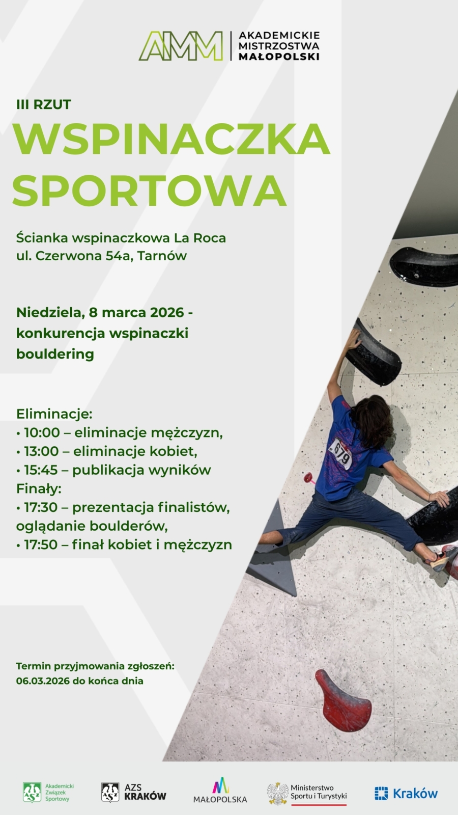 Ścianka La Roca Czerwona 54a, TarnówW niedzielę, 8 marca na ściance wspinaczkowej La Roca przy ul. Czerwonej 54a rozegrane zostaną Akademickie Mistrzostwa Małopolski we wspinaczce sportowej w konkurencji bouldering. Harmonogram zawodów Eliminacje 10–12.30 – eliminacje […]