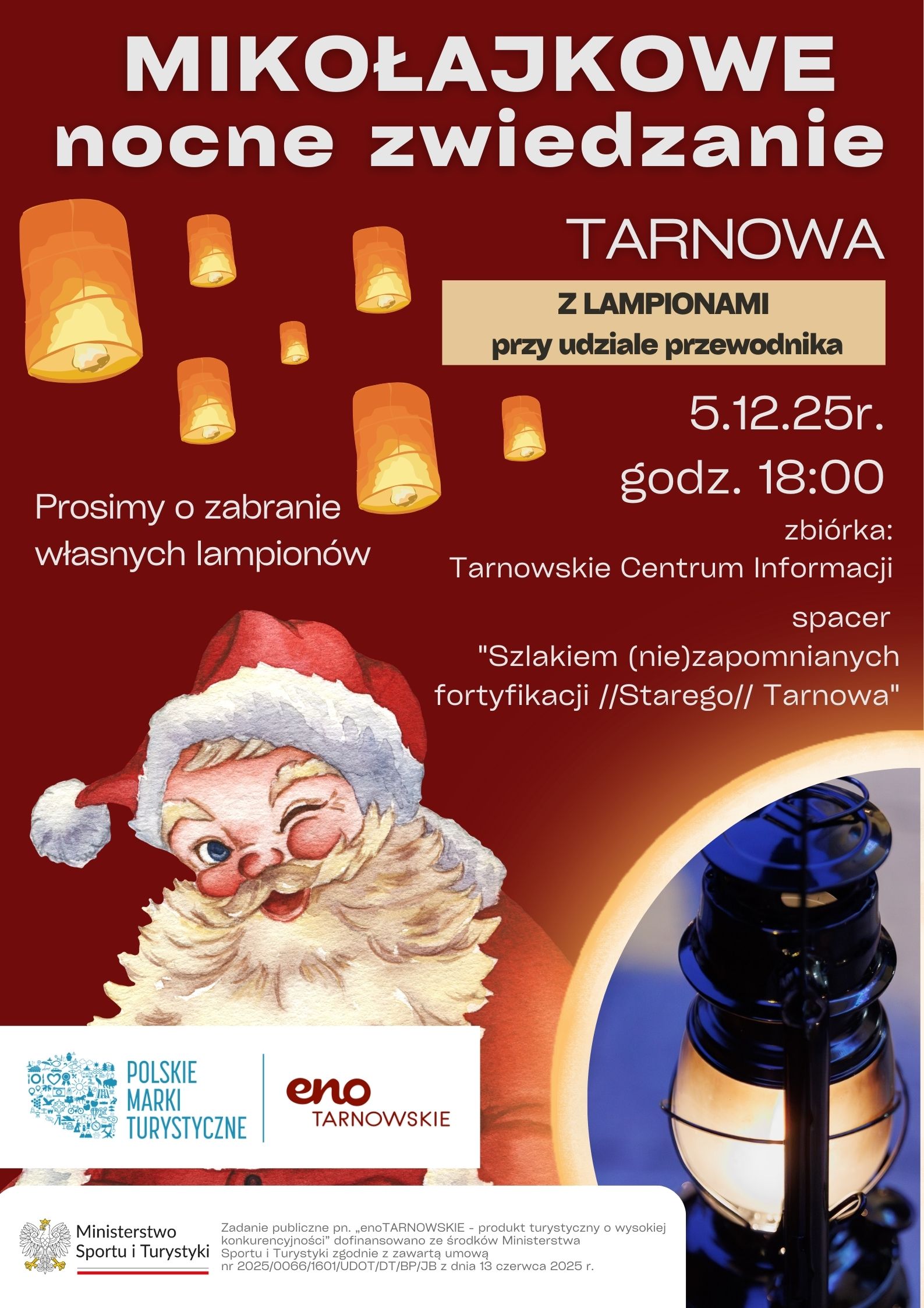 Zapraszamy na wyjątkowe wydarzenie - mikołajkowe zwiedzanie Tarnowa z lampionami. Tematem spaceru "Szlakiem (nie)zapomnianych fortyfikacji Starego Tarnowa". Spacer z przewodnikiem będzie miał oprawę blasku lampionów- organizator prosi o zabranie własnych. Zbiórka pod Tarnowskim Centrum Informacji, Rynek 7 o 18.00.