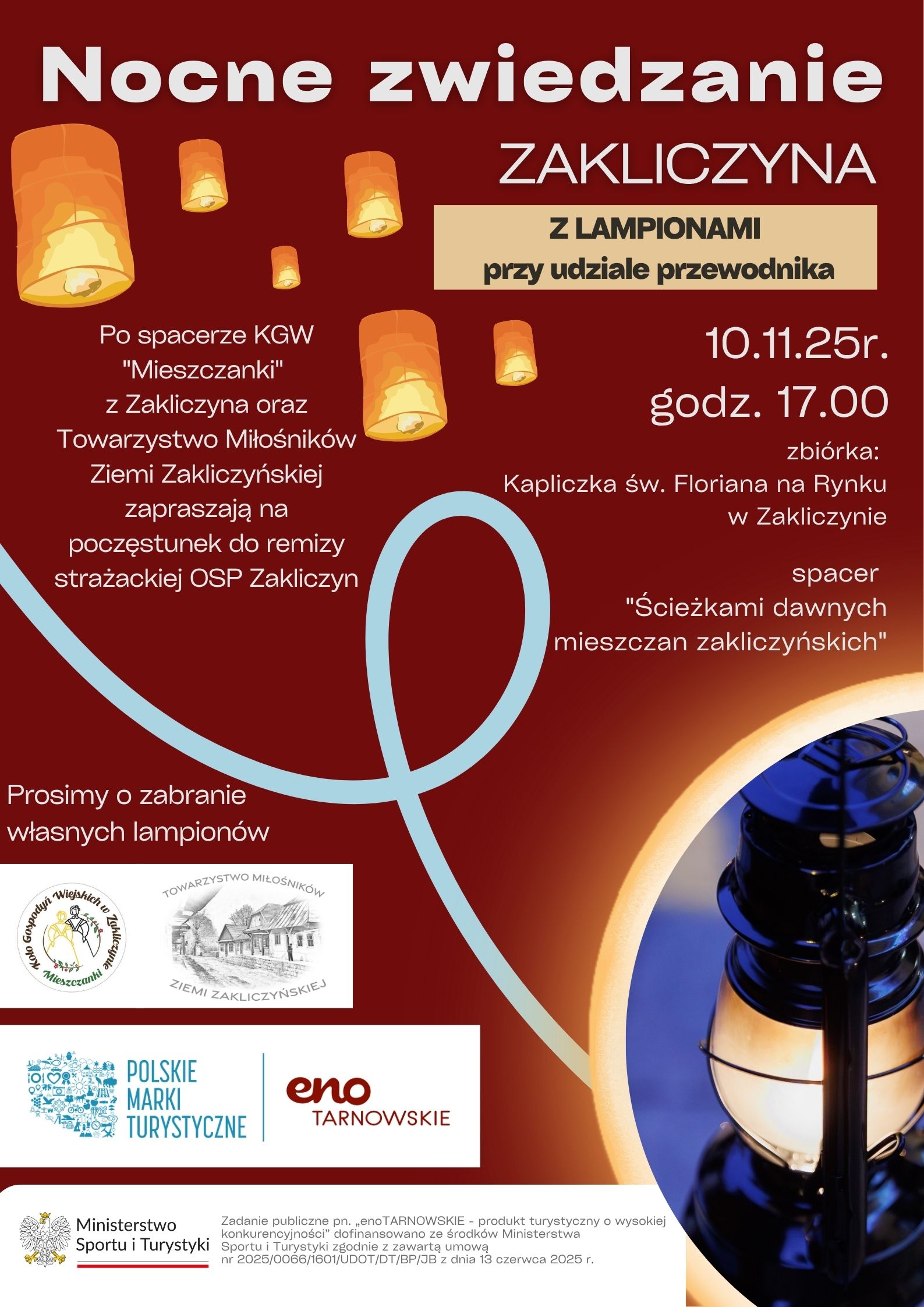Zakliczyn Tarnów, małopolskie, PolskaZapraszamy na nocne zwiedzanie Zakliczyna z przewodnikiem przy blasku lampionów. Tematem spaceru będzie " Ścieżkami dawnych mieszczan zakliczyńskich". Zbiórka o 17.00 pod kapliczką św. Floriana na Rynku w Zakliczynie. Po spacerze KGW "Mieszczanki" z Zakliczyna oraz Towarzystwo Miłośników Ziemi Zakliczyńskiej zapraszają na poczęstunek do remizy OSP w Zakliczynie.