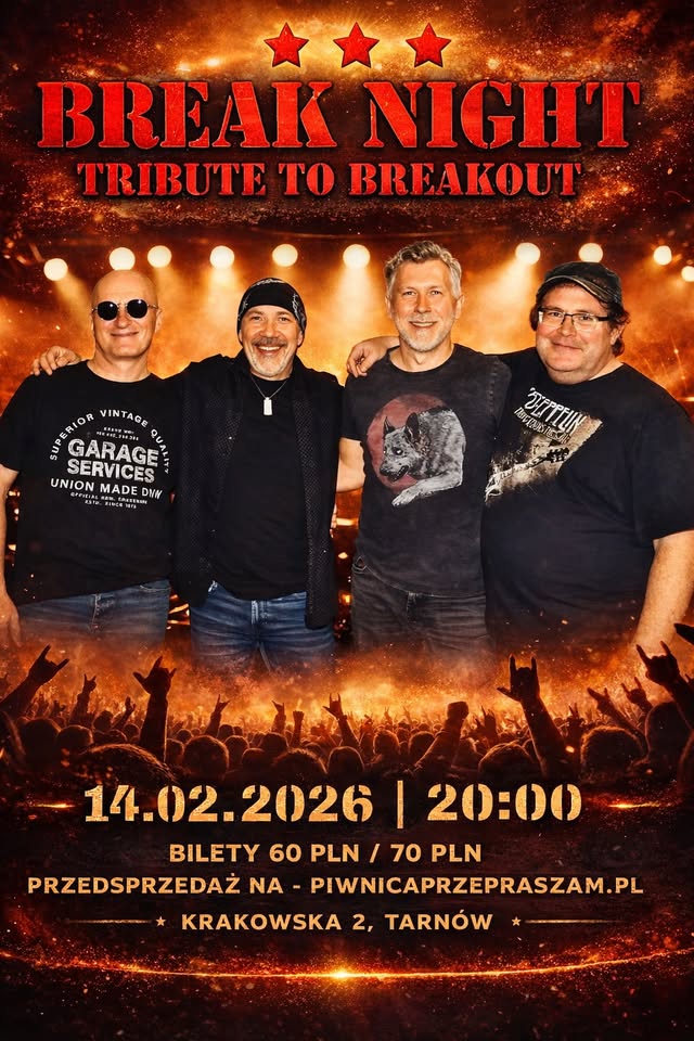 Piwnica "Przepraszam" Krakowska 2, Tarnów, małopolskieKoncert Tribute to Breakout by Break Night w Piwnicy "Przepraszam" w Tarnowie, czyli romantycznie, nastrojowo, z największymi przebojami zespołu Breakout. Początek godz. 20. Bilety: 60/70 zł.
