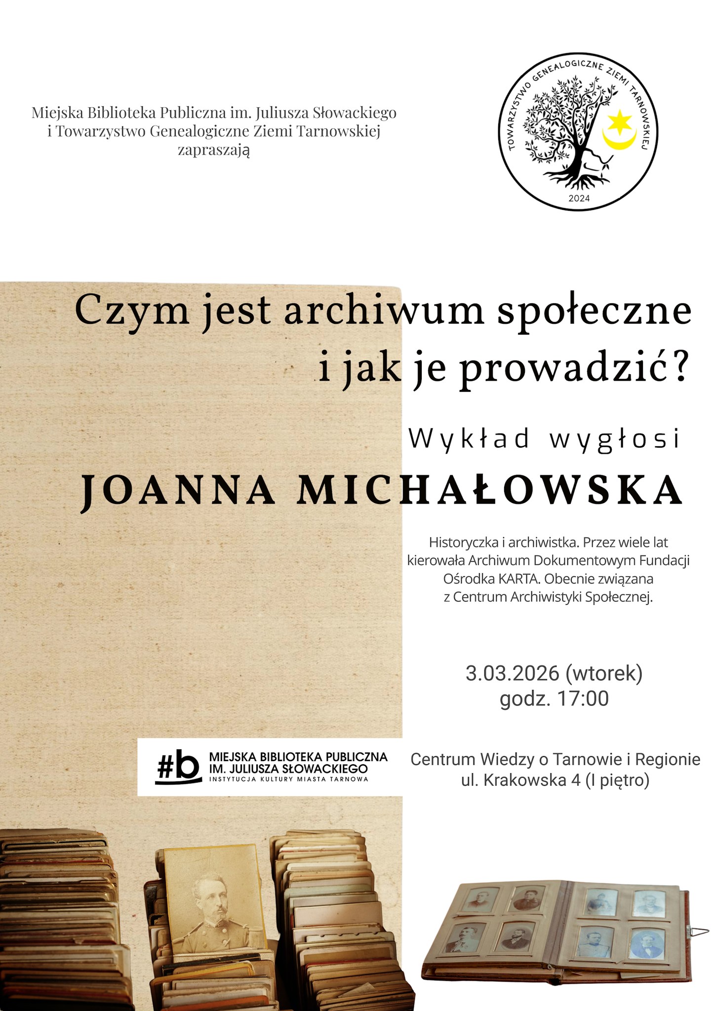 Miejska Biblioteka Publiczna ul. Krakowska 4, Tarnów, małopolskieSpotkanie wykładowe Towarzystwa Genealogicznego Ziemi Tarnowskiej we wtorek 03.03.2026 o godz. 17.00. Prelegentka Pani Joanna Michałowska z Centrum Archiwistyki Społecznej przybliży tematykę tworzenia i korzystania z archiwów społecznych. Wstęp wolny. […]