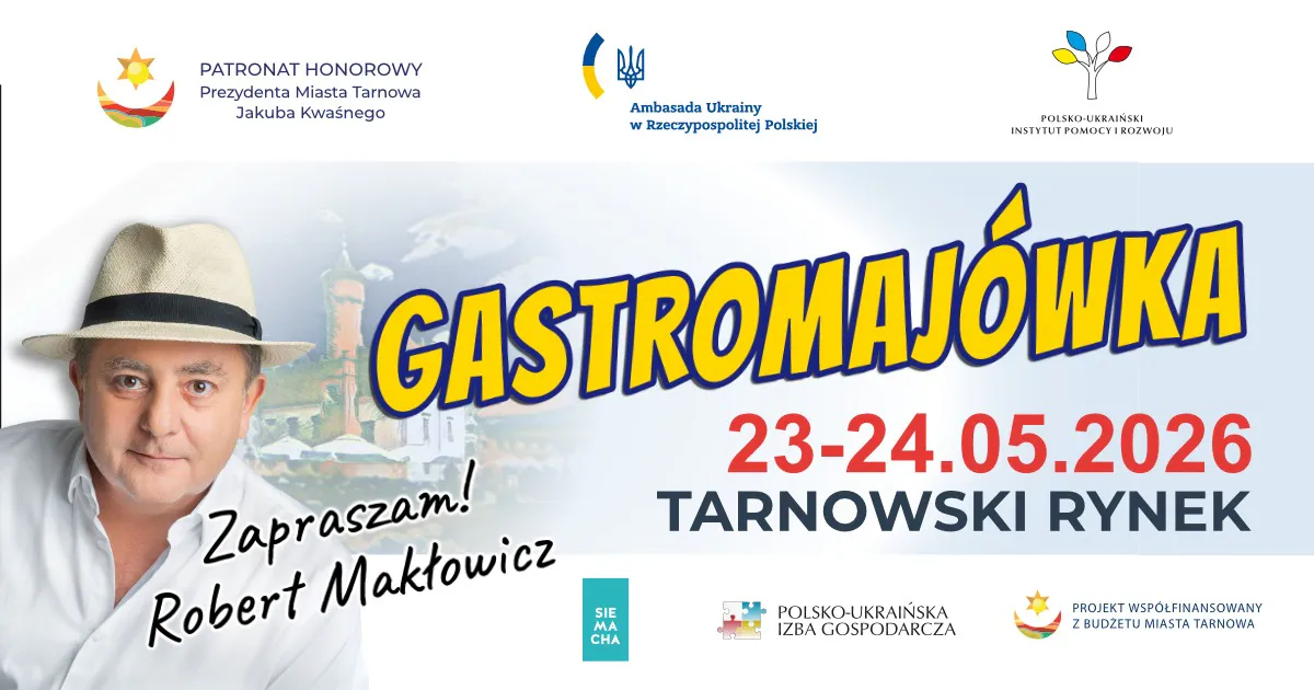 23–24 maja 2026 na Tarnowskim Rynku odbędzie się kulinarne święto. Przed nami Gastromajówka – dwa dni pełne pysznego jedzenia, wyjątkowych aromatów i świetnej atmosfery! Na wydarzenie zaprasza: Robert Makłowicz